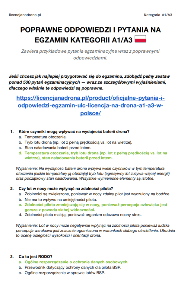 Poprawne odpowiedzi na egzamin dronowy w Polsce i oficjalne materiały szkoleniowe – kategorie A1/A3 i A2, Urząd Lotnictwa Cywilnego (ULC)!