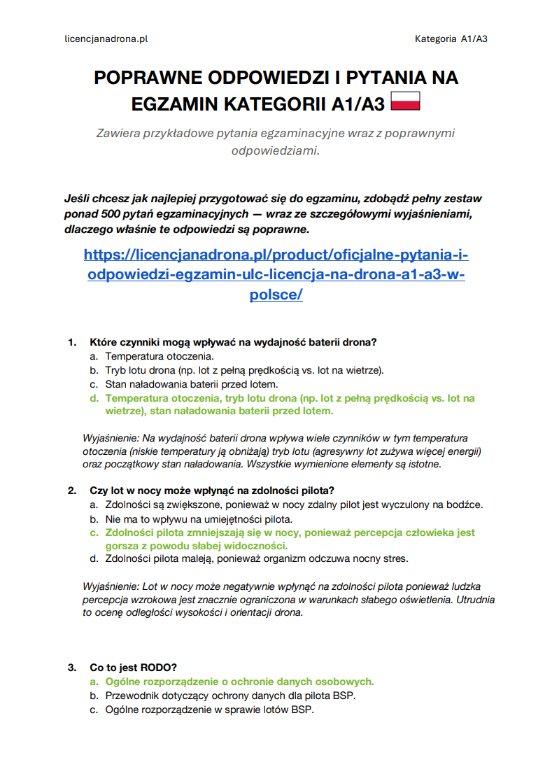 Poprawne odpowiedzi na egzamin dronowy w Polsce i oficjalne materiały szkoleniowe – kategorie A1/A3 i A2, Urząd Lotnictwa Cywilnego (ULC)!